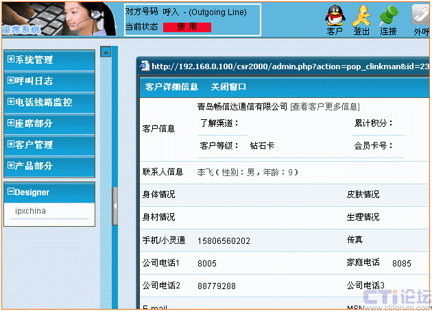 當客戶來電轉(zhuǎn)接人工服務時,自動彈出信息登記窗口并根據(jù)來電號碼檢查客戶資料庫中是否有該客戶的數(shù)據(jù)。如客戶的名稱、地址、聯(lián)系電話、身體狀況、膚色、以往的咨詢、投訴等記錄信息。以及來電日期、時間、受理人等;使座席人員一目了然,第一時間了解來電的相關(guān)信息。