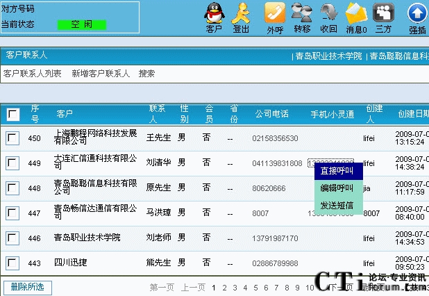 9. 外呼功能:座席人員可以選擇并點(diǎn)擊已有的聯(lián)系人、客戶的電話號碼,系統(tǒng)便自動外呼并接通座席電話,座席人員也可以手工輸入對方號碼,點(diǎn)擊外呼。