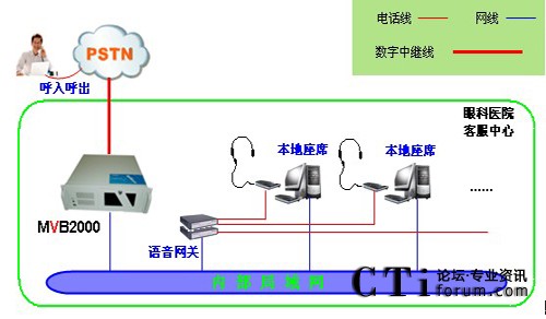 醫(yī)院采用暢信達(dá)通信MVB2000系統(tǒng)作為交換平臺(tái),采用1路E1數(shù)字中繼線接入,對(duì)外公布統(tǒng)一的外線呼入號(hào)碼,采用語(yǔ)音網(wǎng)關(guān)結(jié)合話機(jī)作為座席終端,前期投入8位人工座席,系統(tǒng)架構(gòu)形式如下: