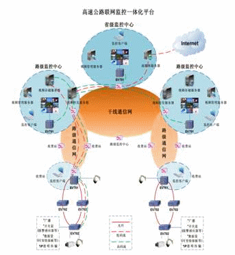 采用H.264編碼標(biāo)準(zhǔn)的EV702外場綜合接入設(shè)備,將原來外場分散的攝像頭、快球、云臺、可變情報板、報警感應(yīng)器等設(shè)備融為一體,同時也支持MPEG編碼標(biāo)準(zhǔn)的視音頻接入。EV702配備光纖通信板卡,不需要光端機,可以直接連接光纖,進(jìn)行遠(yuǎn)距離。通過EV702連接成環(huán),并且具有自愈功能。可進(jìn)行集中式(路級監(jiān)控中心)、分布式(各級監(jiān)控中心)存儲。路級中心、區(qū)域中心、省級中心分布式多級監(jiān)控,由省中心統(tǒng)一設(shè)定權(quán)限,進(jìn)行集中管理。