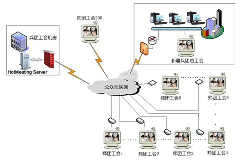 新疆建設(shè)兵團工會下設(shè)有14個師工會,111個團場工會.共有200個用戶同時參加視頻會議。中心服務(wù)器帶寬為100M光纖,各地終端通過網(wǎng)通2M寬帶接入,每個師、團級會場都有自己獨立的機房和會議室,適合進行基于IP網(wǎng)絡(luò)視訊會議的應用,在這個網(wǎng)絡(luò)平臺上,優(yōu)視(URSACOM)HotMeeting富媒體視頻會議系統(tǒng)所提供的高質(zhì)量的視頻圖像和方便易用的文檔、文件共享功能,使得兵團工會領(lǐng)導能夠在這個平臺上進行從桌面討論到會議室正式會議等各種規(guī)模應用。通過HotMeeting富媒體視頻會議系統(tǒng),除了進行全團工會系統(tǒng)例會,工作交流等常見的應用之外,遠程培訓等也是經(jīng)常進行的內(nèi)容。各個師、團工會系統(tǒng)能利用數(shù)據(jù)功能和兵團總工會協(xié)調(diào)業(yè)務(wù),也能把平常培訓的會議材料進行詳細介紹,節(jié)約了以前培訓所花費的大量精力和時間。具體網(wǎng)絡(luò)拓撲見下圖: