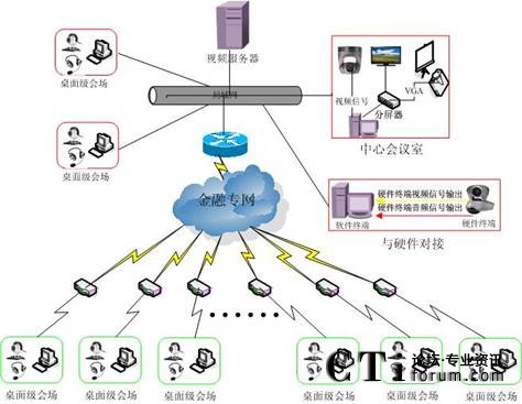 根據(jù)上圖可以知道,在全南縣信用社中心機(jī)房部署一臺(tái)視頻服務(wù)器,這臺(tái)視頻服務(wù)器主要提供各個(gè)會(huì)場進(jìn)行召開會(huì)議訪問,同時(shí)提供遠(yuǎn)程對系統(tǒng)管理和維護(hù)功能;在全南縣信用社硬件視頻會(huì)議室部署一臺(tái)帶有采集卡PC主機(jī),這臺(tái)PC用和硬件視頻會(huì)議對接,由硬件視頻會(huì)議提供一路視頻和一路音頻輸出信號,再把硬件提供輸出視頻信號接入PC主機(jī)上采集卡上,輸出音頻信號接入PC主機(jī)聲卡麥克風(fēng)上,這樣只要開會(huì)是把這臺(tái)PC主機(jī)訪問視頻服務(wù)器登錄會(huì)議室其它會(huì)場就可以收聽收看到硬件視頻會(huì)議會(huì)內(nèi)容。其它各個(gè)支行和網(wǎng)點(diǎn)會(huì)場通過金融專網(wǎng)訪問視頻服務(wù)器,就可以參加會(huì)議、培訓(xùn)、討論交流問題等功能。