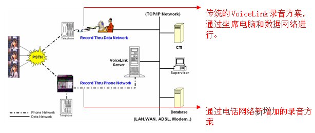 Voicelink 監(jiān)控錄音方案完全適應現(xiàn)代呼叫中心的環(huán)境。Voicelink能有效的節(jié)約成本,它不需要專用硬件,能有效的利用包括座席計算機和網(wǎng)絡等公司的現(xiàn)有資源來進行日常電話錄音。但考慮到有些呼叫環(huán)境只有涉及到電話呼入和呼出,也不用跟業(yè)務應用或后臺數(shù)據(jù)(如證券交易平臺)交互,現(xiàn)在,Voicelink增加了錄音方式來提高解決方案的能力,該錄音方式是通過電話網(wǎng)絡來錄音的,該新增加的錄音方式完全獨立于計算機和數(shù)據(jù)網(wǎng)絡。下圖顯示Voicelink提供不同的方式,形成一個單一的錄音平臺。