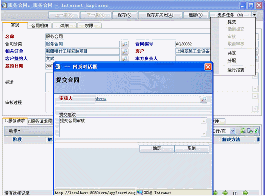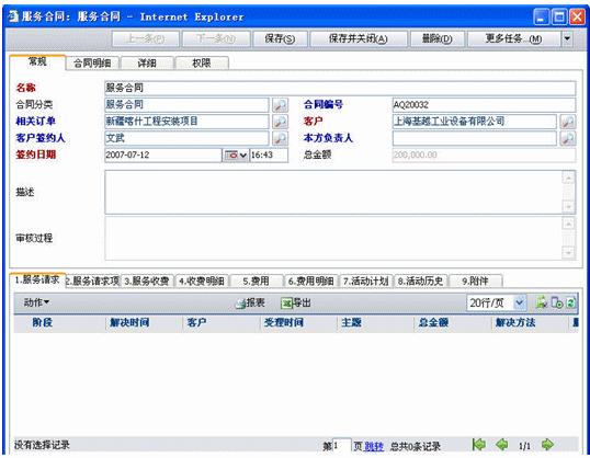 服務合同是也分為兩種,一種是非公司項目的服務請求此時沒有與訂單關聯(lián);二種是公司項目后服務請求,此時可以關聯(lián)訂單也可以不關聯(lián)訂單,如果關聯(lián)訂單就可以將訂單產(chǎn)品明細導入合同明細中(導入明細是可以調(diào)整數(shù)量和價格的).