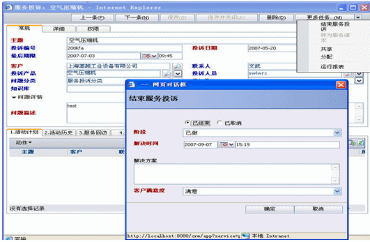 服務投訴,公司服務投訴由前臺接收然后轉交工程服務人員受理即是由工程服務部經(jīng)理審核通過后轉為服務請求,從而生成派工單提交總經(jīng)理處審批.