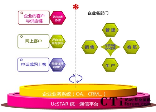UcSTAR統(tǒng)一通信平臺是為企業(yè)提供從內(nèi)部溝通、協(xié)作與外部服務(wù)于一體的高效通信通道,并與企業(yè)的業(yè)務(wù)系統(tǒng)融合,實現(xiàn)統(tǒng)一通訊、統(tǒng)一登錄、統(tǒng)一消息、統(tǒng)一門戶的統(tǒng)一工作平臺。