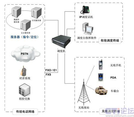 - 線調度終端包括:手機、PDA、車載臺等無線設備――這些設備通過無線基站連接到有線網(wǎng)絡,分別配備不同的調度軟件實現(xiàn)調度功能。