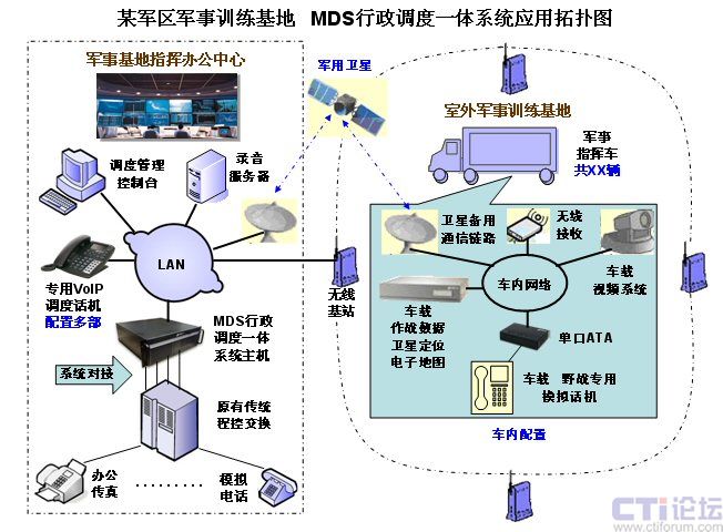為了加強現(xiàn)代化軍隊的建設,某軍區(qū)在其軍分區(qū)的指揮訓練基地,使用先進的技術,搭建了一套由幾十輛軍事指揮車組成的作戰(zhàn)指揮訓練系統(tǒng),其中的語音通信指揮系統(tǒng)部分,采用了美國Zed-3公司最先進的基于IP技術的MDS80行政調度一體化通信系統(tǒng),解決了訓練基地的指揮中心大樓的原有通信系統(tǒng),與室外的訓練基地各輛指揮車之間,通過基地無線網(wǎng)絡及衛(wèi)星備份鏈路提供的IP通道,實現(xiàn)語音的指揮調度通信,達到訓練基地要求的最佳的語音指揮調度通信效果。