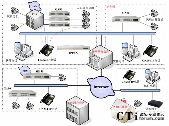 具體情況是:和平里的總部與沙河辦公區(qū)之間為網(wǎng)絡專線,并有公網(wǎng)出口。各辦事處使用ADSL撥號上網(wǎng)方式?偛康姆桨冈O(shè)計中,使用了5臺GA90網(wǎng)關(guān),兩臺IPPBX以及多部IP話機和軟件電話。和平里辦公區(qū)工位數(shù)量為120左右,其中多數(shù)工位需要部署模擬話機,個別工位屬于非固定的移動工位,需要部署CN2x4