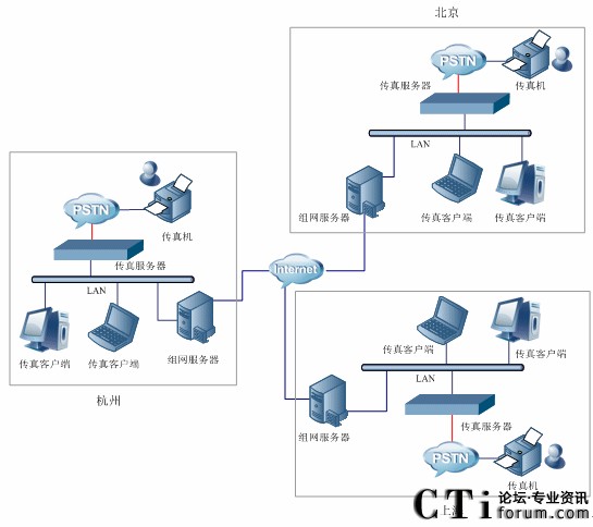 圖1-2 三匯傳真服務(wù)器典型組網(wǎng)圖(多服務(wù)器)