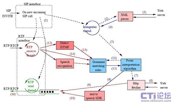 1. 當(dāng)瀏覽器接收到一個(gè)新進(jìn)來的SIP呼叫后,它創(chuàng)建三個(gè)不同線程:RTP接收線程、RTP發(fā)送線程和VoiceXML解釋器線程。RTP接收線程從主叫方接收媒體數(shù)據(jù)包并調(diào)用DTMF檢測(cè)模塊;RTP發(fā)送線程將媒體數(shù)據(jù)包以流的方式發(fā)送給主叫方。一個(gè)單獨(dú)的發(fā)送線程幫助維護(hù)外出數(shù)據(jù)報(bào)的固定帶寬(比如針對(duì)G.711音頻的64