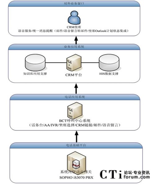 原先電話系統(tǒng)與CRM系統(tǒng)是獨立的兩個系統(tǒng),客服人員面對大量的客戶,迅速的獲悉來電客戶的身份、背景資料以及歷史資料在很大程度上決定了其服務質量。BCT呼叫中心系統(tǒng)位于PBX與CRM之間,作為一個中間的橋梁,對PBX送來的電話信息或者用戶輸入的卡號等數(shù)據(jù)進行處理分析,對主叫號碼或用戶輸入卡號進行識別后,傳遞給CRM;CRM檢索與其相連的HIS(醫(yī)院信息系統(tǒng))的數(shù)據(jù)庫,將客戶資料以及相關的歷史記錄通過彈出網頁的模式,同步的顯示在坐席的計算機上,方便客服代表的輸入和后續(xù)操作,提高了效率與正確率。同時,客戶代表還可以在CRM頁面中點擊電話號碼,通過BCT發(fā)起電話呼叫來聯(lián)系客戶,來處理用戶回訪等工作。