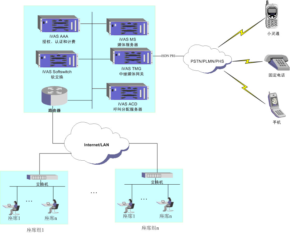 - iVAS Agent:人工座席,可以采用IAD+普通的電話,或者SoftPhone方式接聽(tīng)來(lái)電