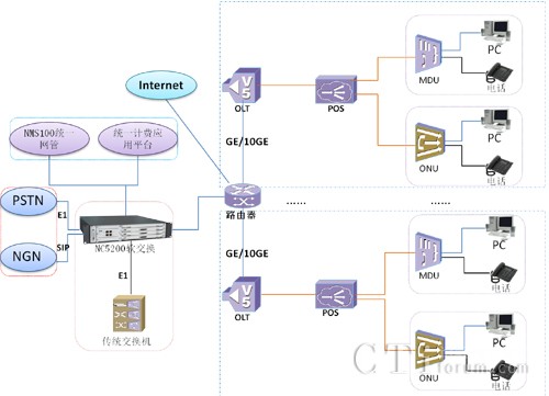 震有科技根據(jù)行業(yè)客戶的需求,推出了“NC5200系列產(chǎn)品+xPON產(chǎn)品”的行業(yè)接入網(wǎng)綜合應(yīng)用解決方案,即“NGN+xPON”行業(yè)應(yīng)用解決方案。該方案主要采用了NGN架構(gòu)的軟交換技術(shù)與xPON技術(shù)相結(jié)合,實(shí)現(xiàn)了從傳統(tǒng)的接入網(wǎng)向光纖接入網(wǎng)平滑過渡升級。該解決方案中NC5200系列產(chǎn)品主要完成語音交換及與語音相關(guān)的增值業(yè)務(wù)功能;xPON產(chǎn)品在該方案中作為語音、數(shù)據(jù)、視頻業(yè)務(wù)的承載平臺,主要滿足了語音、數(shù)據(jù)及CATV或IPTV綜合業(yè)務(wù)接入要求。