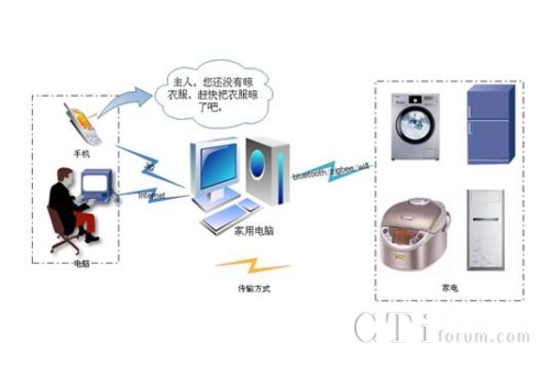 家電遠(yuǎn)控系統(tǒng)的原理是利用電腦或者手機(jī)的電源管理系統(tǒng),來管理用戶終端軟件管理電源的開關(guān)、定時、預(yù)設(shè)時間等,利用互聯(lián)網(wǎng)或者手機(jī)網(wǎng)絡(luò)把信號傳輸?shù)郊彝ル娔X,家庭電腦當(dāng)作小型服務(wù)器或者信號轉(zhuǎn)發(fā)點,把信號利用藍(lán)牙、zigbee、wifi等無線傳輸?shù)街付ǖ碾娫床遄?dāng)然每個電源插座都要有相應(yīng)的信號接收模塊實現(xiàn)和家庭電腦的信號傳輸,實現(xiàn)了對電源的管理功能。家電遠(yuǎn)控終端軟件嵌入語音合成軟件,利用合成語音報讀預(yù)設(shè)的提醒內(nèi)容和時間提醒,具有危急情況下的報警功能。當(dāng)然如果我們是在家里,可以直接用手機(jī)通過藍(lán)牙對電源插座進(jìn)行管理,或者通過家庭電腦進(jìn)行管理。如圖所示: