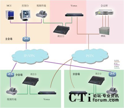 系統(tǒng)基于PSTN電話網(wǎng)絡(luò), 在視頻會議系統(tǒng)中心會場配備一套POLYCOM VORTEX EF2241與會場調(diào)音臺聯(lián)結(jié),并根據(jù)會場數(shù)量配備一套相應(yīng)方數(shù)的音頻會議橋,各分會場分別配備一套POLYCOM VORTEX EF2211與會場調(diào)音臺聯(lián)結(jié),如用戶無線路條件,也可使用當(dāng)?shù)剡\營商的電話會議平臺。