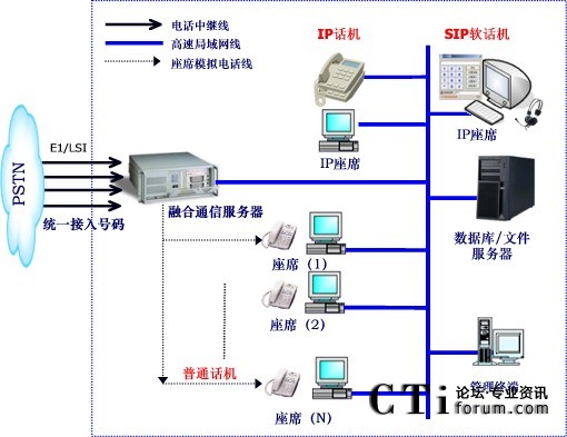融合通信服務(wù)器既可以安裝基于TDM的座席卡,提供普通電話座席,同時(shí)也支持Dialogic HMP主機(jī)媒體處理軟件,通過IPCall