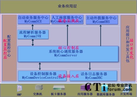 系統(tǒng)平臺層:MyComm是一個(gè)基于硬件支撐平臺之上的CTI應(yīng)用開發(fā)中間件。對下屏蔽了復(fù)雜的硬件通控制;對上,簡化和提高業(yè)務(wù)應(yīng)用的實(shí)際、開發(fā)和應(yīng)用