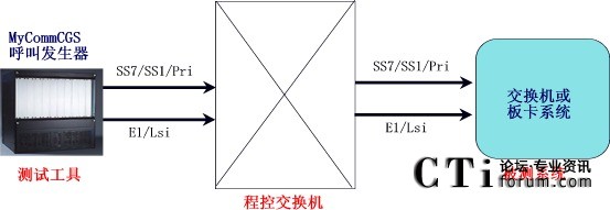 交換方案將MyCommCGS呼叫發(fā)生器和被測系統(tǒng)都通過同樣的電纜和信令方式連接到公網(wǎng)的程控交換機上,由呼叫發(fā)生器模擬公網(wǎng)用戶通過程控交換機向被測系統(tǒng)發(fā)起呼叫。