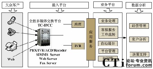 隨著呼叫中心技術的發(fā)展,傳統(tǒng)的語音通話已不能滿足日益增長的業(yè)務需求,TC-IPCC平臺整合了視頻Video、文本Text、電子郵件Email、短消息SMS、互聯(lián)網(wǎng)Web以及3G等多媒體通訊方式。高效、統(tǒng)一的把各種媒體渠道融合在一起,并極大地拓展了聯(lián)絡中心業(yè)務應用的類型和范圍。