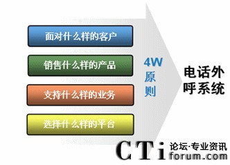 基于外呼的精準(zhǔn)營(yíng)銷(xiāo)模式,要符合4W原則:即面對(duì)什么樣的客戶,銷(xiāo)售什么樣的產(chǎn)品,支持什么樣的業(yè)務(wù),選擇什么樣的平臺(tái)。
