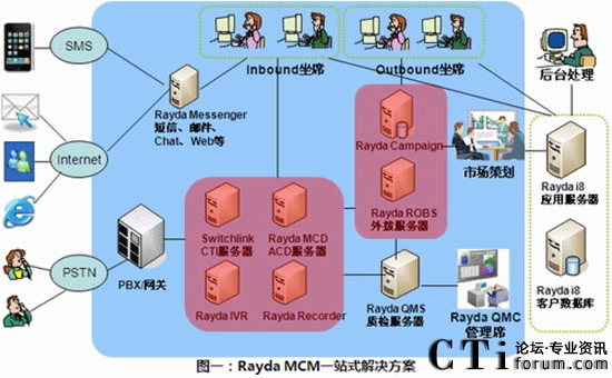 Rayda MCM多渠道呼叫管理平臺,是呼叫中心基礎(chǔ)呼叫業(yè)務(wù)的信息化支撐平臺系統(tǒng)。Rayda MCM以先進(jìn)的呼叫信息交互為核心,涵蓋呼叫中心系統(tǒng)所必須的ACD、IVR、PD、錄音、質(zhì)檢等基本功能,更整合了統(tǒng)一通信、電話營銷等多項(xiàng)企業(yè)迫切需要的功能。MCM支持支持從板卡、傳統(tǒng)PBX到IPPBX網(wǎng)絡(luò)等各種接入方式的建設(shè),支持從單點(diǎn)到分布式等各種組網(wǎng)方式,適應(yīng)從中小企業(yè)到外包型等各種規(guī)模呼叫中心的需求。