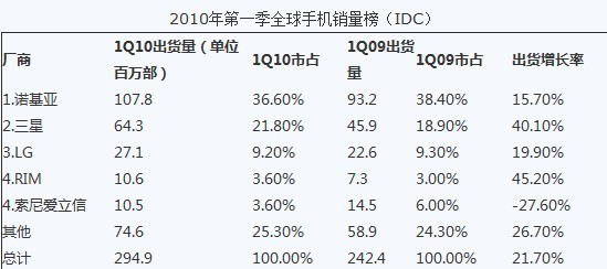 另外,福布斯雜志網(wǎng)站指出,摩托羅拉一季度僅有850萬(wàn)部的手機(jī)出貨量顯示,他們已經(jīng)被蘋(píng)果公司(一季度出貨iPhone 875萬(wàn)部)超越。也就是說(shuō),現(xiàn)在蘋(píng)果已經(jīng)成為美國(guó)第一大手機(jī)制造商?紤]到蘋(píng)果實(shí)際上只有一款手機(jī)產(chǎn)品,這一事實(shí)確實(shí)相當(dāng)驚人。如果iPhone繼續(xù)以目前的高增速發(fā)展下去,也許過(guò)不了多久它就將替代索尼愛(ài)立信,同樣進(jìn)入全球前五大手機(jī)廠商的行列。