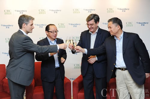 從左到右為:Marc Faucher(黑莓合作伙伴基金合伙人),田溯寧先生(CBC寬帶資本創(chuàng)始人),謝國睿先生(RIM中國區(qū)總裁),許志明先生(CBC寬帶資本投資團(tuán)隊(duì)成員)