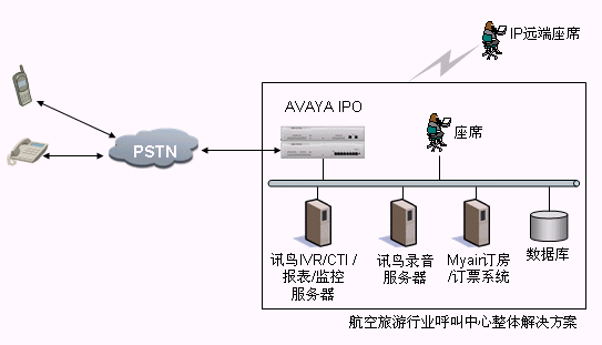 本方案采用AVAYA IP OFFICE系列交換機(jī),通過(guò)訊鳥中間件控制整個(gè)呼叫中心的電話呼入、呼出。它支持多種聯(lián)絡(luò)渠道,包括語(yǔ)音、交互式自動(dòng)語(yǔ)音應(yīng)答(IVR)、傳真、電子郵件、web、短消息等,同時(shí)利用Myair航空管理系統(tǒng)來(lái)完成整個(gè)業(yè)務(wù)流程。