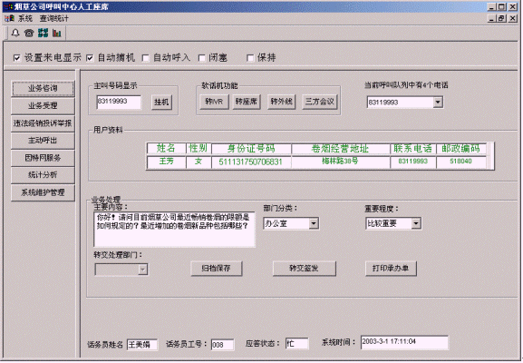 客戶打入電話后,當(dāng)系統(tǒng)的自動(dòng)語音應(yīng)答子系統(tǒng)無法解決客戶問題時(shí),客戶可選擇人工服務(wù),由企業(yè)客戶服務(wù)代表直接接聽客戶電話,處理并解決客戶問題。此時(shí)客戶同座席話務(wù)人員直接溝通,并同時(shí)記錄下該客戶的聯(lián)系方式,將相關(guān)數(shù)據(jù)添加入系統(tǒng)數(shù)據(jù)庫;也可以在數(shù)據(jù)庫的支持下回答接受查詢卷煙/價(jià)格/限額/新品種、卷煙經(jīng)營(yíng)規(guī)范制度/卷煙專賣政策法規(guī)咨詢、通報(bào)最近暢銷卷煙的限額情況/通報(bào)最近增加的新品種/煙草公司召集的活動(dòng)通知、投訴和舉報(bào)違法經(jīng)銷行為、卷煙預(yù)訂、電話訪銷、滿意度調(diào)查等。