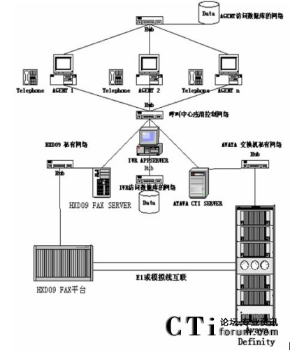 HXD09交換機(jī)通過(guò)E1上的信令完成控制話路,同時(shí)由FAX/IVR SERVER完成業(yè)務(wù)控制如放音、收號(hào)、收發(fā)傳真等。