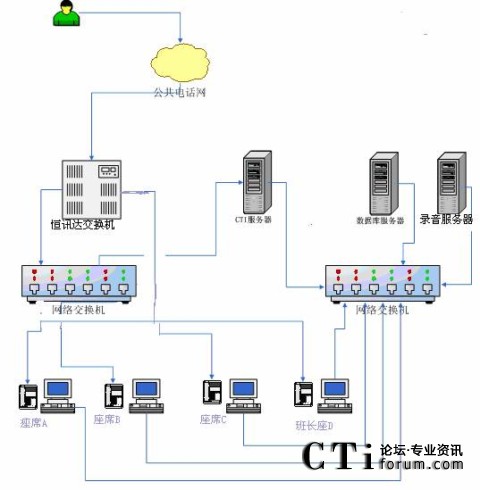根據(jù)以上業(yè)務設計框架,我們確定了客服中心搭建時所需要的設備,系統(tǒng)的拓撲結構示意如下: