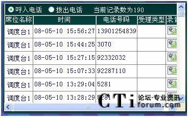 當(dāng)電話打進(jìn)來,話務(wù)員提話機(jī)時系統(tǒng)便自動進(jìn)行錄音,系統(tǒng)把語音信號以數(shù)字化語音格式寫入硬盤。同時系統(tǒng)記錄其通話日期、摘機(jī)時間、掛機(jī)時間和當(dāng)前通話時間等信息,如果該次電話為打出電話,還可記錄其打出的電話號碼。當(dāng)值班人員掛機(jī)時系統(tǒng)便會自動停止錄音。
