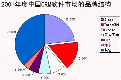 2002年2月27日,賽迪資訊顧問公司(CCID)正式發(fā)布了《2001-2002年中國管理軟件市場研究年度報告》。TurboCRM信息科技有限公司在進入中國市場短短一年多的時間里,憑借其成熟的軟件產品、突出的銷售業(yè)績和專業(yè)的品牌形象,榮獲年度CRM市場銷售客戶數第一,市場份額僅次于全球最大的CRM軟件廠商--Siebel公司,位居第二。