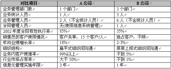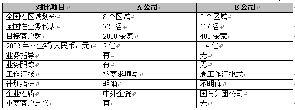 在最近一次對(duì)照了兩家同具有全國(guó)性區(qū)域推廣業(yè)務(wù)的公司之后,我們發(fā)現(xiàn),精細(xì)營(yíng)銷(xiāo)為企業(yè)帶來(lái)的效益是顯著的。我們以A公司表示采用了精細(xì)營(yíng)銷(xiāo),B公司未采用精細(xì)營(yíng)銷(xiāo),表1反映兩家公司的主要數(shù)據(jù)對(duì)照: