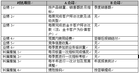 顯然,兩家公司在經(jīng)營(yíng)業(yè)績(jī)和人員規(guī)模上有差不多的基礎(chǔ),但兩家所處的行業(yè)和性質(zhì)有明顯不同,如何評(píng)估兩家企業(yè)精細(xì)營(yíng)銷(xiāo)的管理效益呢?我們?cè)僖员?反映兩家公司對(duì)業(yè)務(wù)代表工作指標(biāo)及糾偏: