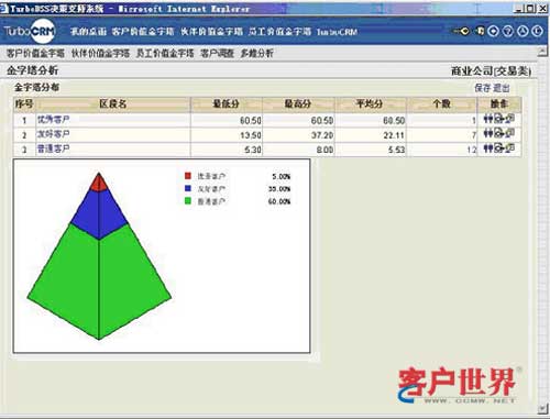 根據(jù)預先設定的客戶價值評估模型,CRM會自動計算出每個客戶的價值得分以及對應到不同等級的客戶價值,并會記錄到客戶項下,便于業(yè)務人員在與客戶接觸時,直觀了解客戶價值情況?蛻魞r值金字塔分析(如圖),可以動態(tài)的了解各類客戶的價值分布。