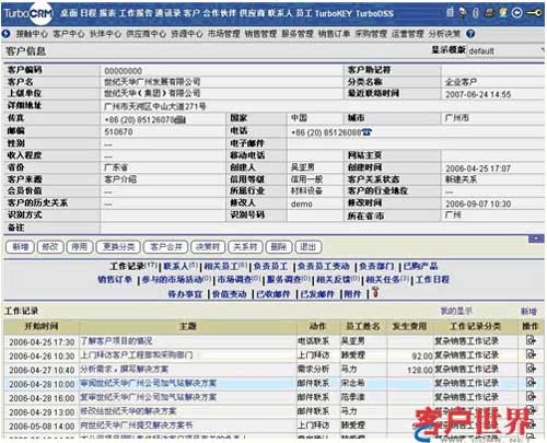 信息整合是CRM系統(tǒng)實現(xiàn)對客戶信息進行管理的基礎,將客戶的各類信息進行關聯(lián),當查詢某個客戶時,與該客戶相關的歷史接觸記錄、交易記錄都可一目了然地展現(xiàn)出來,也可以方便地進行相關信息的及時錄入。(如下圖)
