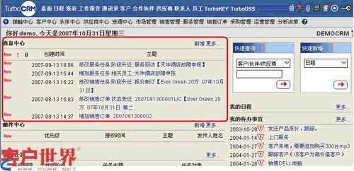 TurboCRM系統(tǒng)的消息中心是協(xié)同工作的核心,當客戶接觸過程有進展時,相關員工的桌面會出現(xiàn)消息提醒,以方便員工及時地了解客戶動態(tài)。