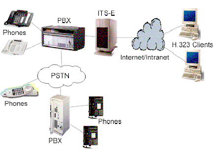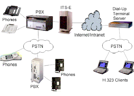 計算機(jī)IP電話產(chǎn)品,類似網(wǎng)絡(luò)會議系統(tǒng),允許用戶使用他們當(dāng)前的IP聯(lián)接把通話接到電腦上去(如通過以太網(wǎng)聯(lián)接到他們的局域網(wǎng)中)。這種作法的局限是PC用戶只可以與另一PC用戶通話。然而,使用ITS-E,這種局限將不存在。任何在網(wǎng)絡(luò)上的PC可使用H.323(用于IP電話上的ITU-T標(biāo)準(zhǔn))軟件包來實現(xiàn)通話,如微軟的網(wǎng)絡(luò)會議系統(tǒng),通過ITS-E服務(wù)器通至一個常規(guī)的電話使用者。電話用戶不需要任何新的裝備,甚至不會意識到聲音是從PC機(jī)中傳出及在IP網(wǎng)絡(luò)中傳輸。示意圖如下: