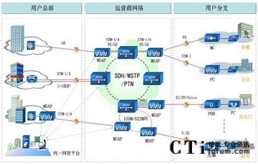 在政府、金融、能源、教育、商業(yè)連鎖等大客戶遠(yuǎn)端機(jī)房,根據(jù)用戶不同類型的業(yè)務(wù)(數(shù)據(jù)、視頻、語音)配置相應(yīng)的轉(zhuǎn)換設(shè)備,如光纖收發(fā)器、V35協(xié)議轉(zhuǎn)換器、以太網(wǎng)協(xié)議轉(zhuǎn)換器、以太網(wǎng)/E1/V35光貓、PDH等,在運(yùn)營商的模塊局/基站等接入機(jī)房部署MSAP機(jī)箱并配置相對應(yīng)的業(yè)務(wù)線卡,將遠(yuǎn)端PDH、FE、V.35、語音等多種接入方式的多路業(yè)務(wù)匯聚后通過STM-1/STM-4等上行口與運(yùn)營商傳輸網(wǎng)SDH/MSTP/PNT對接。在運(yùn)營商中心機(jī)房,可以根據(jù)需要配置機(jī)箱式MSAP,匯聚后通過GE光纖接入用戶中心機(jī)房,也可以直接通過155M/622M/FE/GE光纖接入用戶中心機(jī)房,在用房中心機(jī)房配置MSAP進(jìn)行協(xié)議還原,或直接接入用戶核心路由器的CPOS板卡上。這樣,就完成了整個(gè)專網(wǎng)業(yè)務(wù)的接入。
