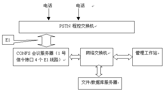 系統(tǒng)主要由網(wǎng)絡(luò)、數(shù)據(jù)庫(kù)服務(wù)器(DBS)、會(huì)議服務(wù)器(CONFS)、管理工作站幾個(gè)部分組成。數(shù)據(jù)庫(kù)服務(wù)器主要負(fù)責(zé)數(shù)據(jù)的存儲(chǔ),而CONFS完成電話(huà)話(huà)路的接入與會(huì)議控制,彼此之間相輔相承。如圖所示: