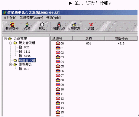 3、系統(tǒng)上方是工具欄,包括:創(chuàng)建會(huì)議、人事管理、啟動(dòng)、集體撥號、雙工/單工、點(diǎn)名、電話薄等快捷鍵。