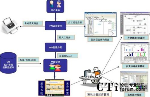 用戶電話呼入時(shí),系統(tǒng)通過(guò)自動(dòng)語(yǔ)音應(yīng)答的方式,實(shí)現(xiàn)用戶服務(wù)的自動(dòng)導(dǎo)航。交互式語(yǔ)音應(yīng)答功能自動(dòng)播放問(wèn)候和語(yǔ)音提示信息,根據(jù)用戶按鍵選擇提供自助服務(wù)或者呼叫中心人工服務(wù)。呼叫中心提供人工服務(wù)后還可以為特定的用戶需求提供人工轉(zhuǎn)IVR自動(dòng)語(yǔ)音服務(wù),比如114查詢到電話、地址后,電信10000號(hào)呼叫中心提供的語(yǔ)音播放服務(wù)。