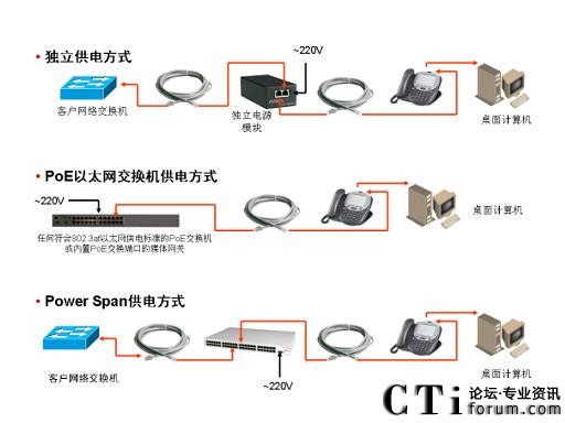 IP電話相對于原有模擬分機(jī)或數(shù)字分機(jī)采用以太網(wǎng)端口連接,其供電方式也相應(yīng)隨之改變,46xx系列IP硬件話機(jī)支持以下3種供電方式: