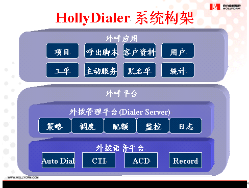 HollyContact是HollyCRM(合力金橋軟件)公司自主開(kāi)發(fā)的CTI中間件產(chǎn)品,借鑒了國(guó)際上多家先進(jìn)而成熟的中間件產(chǎn)品設(shè)計(jì)思想,實(shí)現(xiàn)了呼叫中心CTI控制的全部功能,支持語(yǔ)音、傳真、短信、互聯(lián)網(wǎng)等多媒體的統(tǒng)一接入,具有混合排隊(duì)、智能路由、負(fù)載均衡的先進(jìn)體系結(jié)構(gòu)設(shè)計(jì)。HollyContact是基于COM技術(shù)的完全模塊化設(shè)計(jì),向應(yīng)用層提供標(biāo)準(zhǔn)的開(kāi)發(fā)程序接口,應(yīng)用于支持CSTA國(guó)際標(biāo)準(zhǔn)通訊協(xié)議的呼叫中心系統(tǒng)平臺(tái), 具有統(tǒng)一排隊(duì)、智能路由、語(yǔ)音數(shù)據(jù)同步、 豐富的桌面應(yīng)用、 自動(dòng)人工互轉(zhuǎn)、 系統(tǒng)監(jiān)控、 統(tǒng)計(jì)分析、 雙機(jī)熱備等功能。