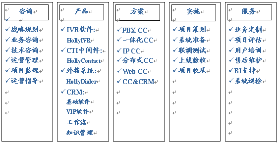 HollyC6支持的業(yè)務(wù)類型包括:客戶服務(wù)中心、咨詢熱線、電子商務(wù)中心、服務(wù)受理中心、預(yù)訂中心、電話營(yíng)銷中心、技術(shù)支持中心等。