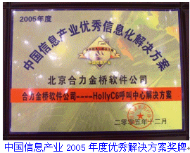 2006年1月10日,北京。中國計算機用戶協(xié)會"2005年度企業(yè)及產品頒獎典禮"在世紀金源大飯店隆重召開。在Call Center(呼叫中心)及CRM(客戶關系管理)領域位居業(yè)界領先地位的HOLLYCRM(合力金橋軟件)公司自主知識產權的HollyC6呼叫中心解決方案再度成為業(yè)界關注焦點,榮獲"中國信息產業(yè)2005年度優(yōu)秀解決方案"大獎。