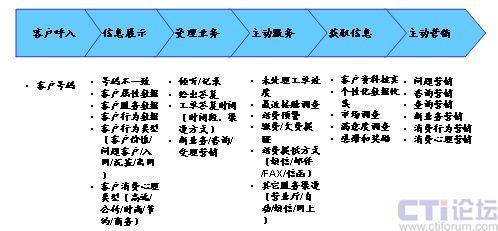 在上面的流程中,將一次客戶接觸,轉(zhuǎn)變?yōu)橐淮稳娴目蛻艋訖C(jī)會,通過對客戶信息360度的洞察和客戶的互動溝通,在為客戶提供基本服務(wù)的同時,根據(jù)客戶的基本資料、歷史消費數(shù)據(jù)等,挖掘客戶的隱性需求,從而有選擇的開展客戶關(guān)懷、客戶信息收集、客戶維系、主動營銷活動。下面以一個電信運營商的客戶呼入流程為例,說明在一個以客戶為中心的客戶接觸流程中,坐席代表可以開展的客戶接觸活動(圖4)。