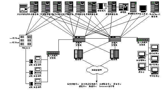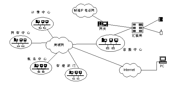 聯(lián)通北京分公司將客戶服務(wù)系統(tǒng)與現(xiàn)有計(jì)費(fèi)、營(yíng)業(yè)、帳務(wù)系統(tǒng)進(jìn)行組織,形成了一個(gè)有機(jī)的結(jié)合體,能夠充分發(fā)揮出現(xiàn)有系統(tǒng)的優(yōu)勢(shì)?蛻舴⻊(wù)系統(tǒng)從營(yíng)業(yè)帳務(wù)系統(tǒng)提取相關(guān)用戶資料,建立客戶服務(wù)的系統(tǒng)資料庫(kù),從計(jì)費(fèi)系統(tǒng)提取相關(guān)用戶話費(fèi)資料等供查詢使用。同時(shí)客服系統(tǒng)還將與北京聯(lián)通現(xiàn)有的計(jì)費(fèi)、營(yíng)業(yè)、帳務(wù)、網(wǎng)管等相關(guān)系統(tǒng)以及Internet相連,提供業(yè)務(wù)處理和用戶自助服務(wù)等業(yè)務(wù)。本客服中心通過(guò)2對(duì)路由器和DDN專線與聯(lián)通北京分公司現(xiàn)有的局域網(wǎng)(包括管理部門、網(wǎng)管中心、計(jì)費(fèi)中心、帳務(wù)中心等相關(guān)系統(tǒng))連接,并通過(guò)該局域網(wǎng)訪問(wèn)Internet。